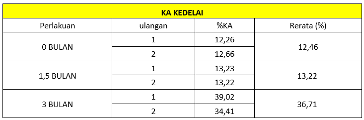 Benih kedelai meskipun tergolong kelompok ortodoks, dikenal sebagai benih berdaya simpan relatif pendek. Pada sistem penyimpanan terbuka, daya simpan benih kedelai dengan kadar air 11% hanya mencapai 3 bulan. Pada kondisi penyimpanan terkendali dengan suhu 18 oC dan kelembaban nisbi 65% daya simpannya dapat mencapai 6–9 bulan (Wirawan dan Wahyuni 2002). Kemunduran mutu benih secara cepat saat disimpan secara terbuka menjadi salah satu faktor pembatas produksi kedelai di daerah tropis (Sucahyono 2013). Untuk itu, perlu upaya pengembangan model simulasi vigor daya simpan benih kedelai. Pada tabel 4.5 Benih kedelai menunjukkan peningkatan kadar air yang lebih besar dibanding jagung, dari 12,46% pada awal penyimpanan menjadi 36,71% setelah 3 bulan. Peningkatan kadar air ini mengindikasikan sifat higroskopis yang lebih tinggi, sehingga benih lebih rentan terhadap pertumbuhan cendawan yang mempercepat kerusakan benih.