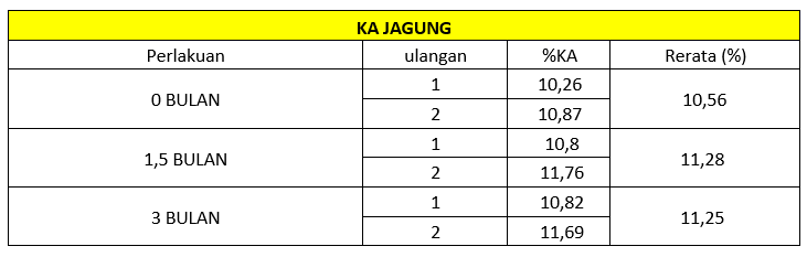 Berdasarkan standar SNI 01-4483-1998 tentang jagung bahan baku pakan, persyaratan mutu yang harus dipenuhi oleh jagung adalah memiliki kadar air sebesar 14%. Proses pengeringan merupakan satu-satunya cara untuk menurunkan kadar air jagung hingga mencapai standar, sehingga pengeringan menjadi bagian yang terpenting dalam memproduksi jagung berkualitas. Menurut Parajuli (2015) Kadar air biji jagung yang yang beredar di masyarakat rata-rata masih memiliki kadar air yang tinggi sehingga tidak bisa untuk dieksport ke luar Negri dan tidak dapat disimpan dalam waktu yang cukup lama, terutama dalam kebutuhan industri kadar air biji jagung maksimal 14%. Pengukuran kadar air dalam suatu bahan sangat diperlukan dalam berbagai bidang terutama bidang pertanian. Mutu jagung terutama ditentukan oleh kadar airnya, semakin tinggi kadar air jagung, mutunya semakin rendah. Tingginya kadar air jagung dapat berakibat pada kerusakan jagung. Menurut Parajuli (2015) bahwa petani di pohuwato hanya mengeringkan jagung tanpa mengetahui kadar air sebelum dan sesudah dilakukan pengeringan sehingga akan berpengaruh terhadap kualitas jagung yang dihasilkan. Pada tabel 4.1 jagung memiliki kadar air awal yang relatif stabil, sekitar 10,56% pada pengamatan awal, dan meningkat menjadi 11,25% setelah 3 bulan. Kadar air ini masih berada pada ambang batas aman untuk penyimpanan sehingga respirasi benih tetap terkendali.