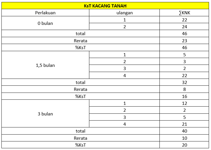Hasil uji vigor keserempakan tumbuh (KsT) dari benih kacang tanah menunjukkan adanya penurunan seiring dengan waktu penyimpanan. Pada awal penyimpanan, yaitu di bulan ke-0, nilai rata-rata KsT mencapai 46%, yang mencerminkan tingkat keserempakan tumbuh yang baik, di mana sebagian besar benih berhasil berkecambah dalam waktu bersamaan. Namun, setelah penyimpanan selama 1,5 bulan, nilai KsT mengalami penurunan yang drastis menjadi hanya 16%. Selanjutnya, pada penyimpanan selama 3 bulan, nilai rata-rata KsT semakin merosot hingga tersisa 10%.