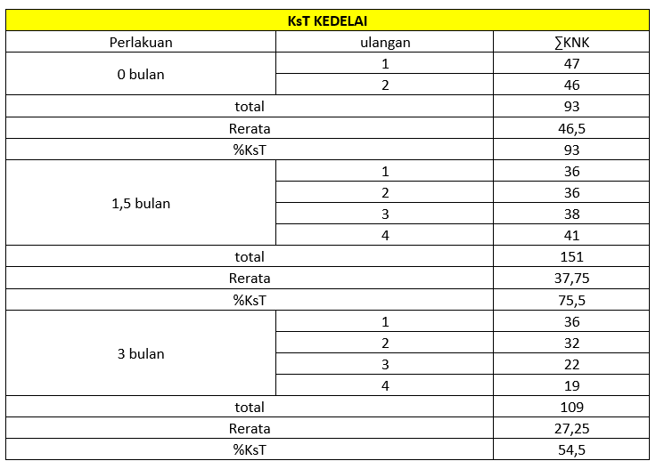 Hasil pengujian keserempakan tumbuh (Kst) menunjukkan bahwa kondisi penyimpanan memiliki pengaruh yang signifikan terhadap keserempakan perkecambahan biji kedelai. Pada penyimpanan selama 0 bulan, rata-rata Kst mencapai 93%, yang berarti hampir semua biji berkecambah secara serempak dalam waktu singkat. Hal ini disebabkan oleh vigor biji yang masih tinggi dan kondisi fisiologis yang stabil. Namun, setelah penyimpanan selama 1,5 bulan, rata-rata Kst menurun menjadi 75,5%, menandakan adanya ketidakserempakan pada proses perkecambahan akibat penurunan vigor. Selanjutnya, pada penyimpanan selama 3 bulan, nilai Kst semakin menurun hingga mencapai 54,5%, yang menunjukkan kehilangan kemampuan biji untuk berkecambah dengan serempak.