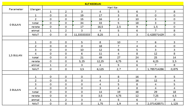 Hasil uji vigor Kecepatan Tumbuh (Kct) pada benih kedelai menunjukkan bahwa penyimpanan memberikan pengaruh signifikan terhadap kecepatan pertumbuhannya. Pada penyimpanan tanpa waktu, yakni 0 bulan, rata-rata Kct benih kedelai mencapai 11,33%, yang merupakan nilai tertinggi jika dibandingkan dengan periode penyimpanan lainnya. Hal ini menandakan bahwa benih masih memiliki vigor yang tinggi, cadangan energi yang cukup, serta kondisi fisiologis yang optimal untuk berkecambah dengan cepat. Namun, setelah disimpan selama 1,5 bulan, rata-rata Kct mengalami penurunan drastis hingga menjadi 1,75%. Penurunan ini disebabkan oleh proses deteriorasi yang menyebabkan kerusakan pada jaringan benih, sehingga menghambat kemampuan perkecambahan. Pada penyimpanan selama 3 bulan, rata-rata Kct semakin menurun menjadi 1,12%, yang mencerminkan bahwa sebagian besar benih telah kehilangan vigor dan mengalami kesulitan untuk berkecambah dengan cepat.