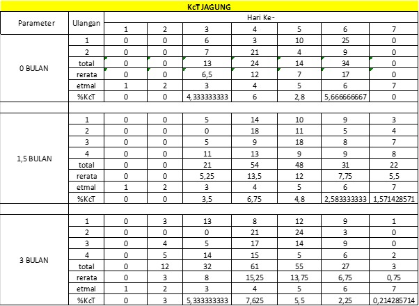 Hasil uji laju pertumbuhan benih jagung (Kct) menunjukkan bahwa penyimpanan 0 bulan menghasilkan laju pertumbuhan yang relatif lebih baik dibandingkan penyimpanan 1,5 bulan dan 3 bulan. Setelah penyimpanan 0 bulan, rata-rata Kct mencapai 5,67%. Hal ini menunjukkan bahwa benih masih mempunyai energi metabolik yang tinggi dan kondisi fisiologis yang optimal untuk perkecambahan. Namun setelah penyimpanan 1,5 bulan, rata-rata Kct menurun menjadi 2,58%. Penurunan ini disebabkan oleh proses kemunduran benih sehingga menyebabkan menurunnya kemampuan cepat berkecambah benih. Setelah penyimpanan 3 bulan, rata-rata nilai Kct mengalami penurunan menjadi 0,21%. Hal ini menunjukkan bahwa sebagian besar benih mengalami penurunan viabilitas dan tidak mampu berkecambah dengan cepat.