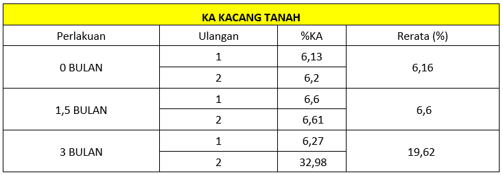 Hasil pengujian kadar air (KA) benih kacang tanah menunjukkan adanya perubahan signifikan selama periode penyimpanan, seperti yang tercantum dalam Tabel 4. 9. Pada awal penyimpanan (0 bulan), kadar air rata-rata benih tercatat sebesar 6,16%, yang masih berada dalam batas aman untuk penyimpanan. Namun, setelah 1,5 bulan, kadar air meningkat menjadi 6,6%, menandakan adanya sedikit penyerapan uap air dari lingkungan sekitar.