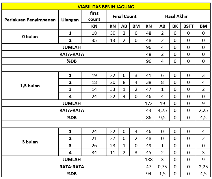 Uji viabilitas benih jagung pada periode penyimpanan yang berbeda menunjukkan perbedaan persentase kelangsungan hidup yang nyata. Pada penyimpanan 0 bulan pada Tabel 4.2, tingkat kelangsungan hidup benih jagung sangat tinggi dengan nilai rata-rata 96. Hal ini menunjukkan bahwa benih yang baru dipanen mempunyai kesegaran yang optimal dan potensi perkecambahan yang maksimal.