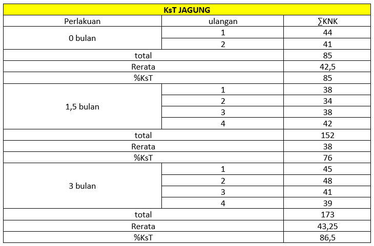 Uji vigor Keserempakan Tumbuh (Kst) dalam benih jagung menerangkan bahwa penyimpanan 0 bulan membuat nilai Kst yg tertinggi dibandingkan menggunakan penyimpanan lainnya.Pada penyimpanan 0 bulan, homogen-homogen Kst mencapai 85%, yg menerangkan bahwa sebagian akbar benih bisa berkecambah secara seragam pada saat yg nisbi bersamaan.Namun, dalam penyimpanan 1,lima bulan, homogen-homogen Kst menurun sebagai 76%.Penurunan ini terjadi lantaran beberapa benih mengalami keterlambatan atau kegagalan berkecambah dampak proses fisiologis yg terganggu selama penyimpanan.Pada penyimpanan tiga bulan, homogen-homogen Kst sedikit semakin tinggi sebagai 86,lima%, tetapi nilai ini menerangkan variasi keserempakan yg lebih mini dibandingkan menggunakan penyimpanan 0 bulan.