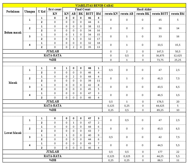 Sebagai tambahan, faktor genetik juga memengaruhi hasil perkecambahan benih cabai. Beberapa varietas cabai memiliki ketahanan yang lebih tinggi terhadap senyawa penghambat perkecambahan, sehingga benih dari buah yang lebih muda pun dapat berkecambah dengan baik pada kondisi tertentu (Ristiani et al., 2023). Oleh karena itu, penting untuk memilih benih dari varietas yang tepat untuk meningkatkan hasil perkecambahan.
