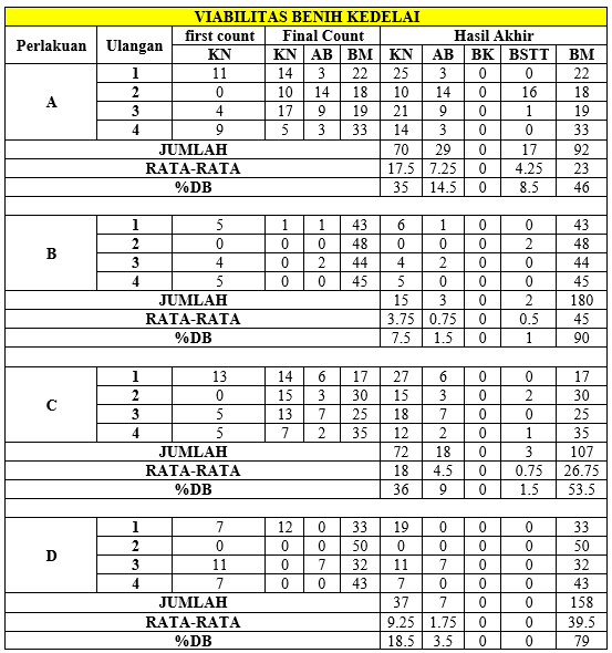 Data pada tabel menunjukkan hasil uji viabilitas benih kedelai berdasarkan empat perlakuan (A, B, C, dan D) dengan empat kali pengulangan. Perlakuan A menghasilkan rata-rata kecambah normal (KN) sebesar 17,5, kecambah abnormal (AB) 7,25, benih mati (BM) 23, dan daya berkecambah (%DB) 46%. Perlakuan ini menunjukkan daya berkecambah yang cukup rendah dengan jumlah benih mati yang tinggi. Pada perlakuan B, rata-rata kecambah normal sangat rendah, yaitu 3,75, dengan AB 0,75 dan BM 45, namun daya berkecambahnya cukup tinggi, yaitu 90%. Meski demikian, dominasi benih mati menunjukkan hasil yang kurang optimal. Perlakuan C menghasilkan rata-rata KN sebesar 18, AB 4,5, BM 26,75, dan %DB 53,5%. Daya berkecambah perlakuan ini lebih baik dibandingkan A, tetapi masih berada pada tingkat sedang. Perlakuan D memiliki hasil terbaik, dengan rata-rata KN tertinggi sebesar 18,5, AB 3,5, BM 39,5, dan %DB mencapai 79%. Perlakuan ini menunjukkan viabilitas benih kedelai yang lebih konsisten dibandingkan perlakuan lainnya.